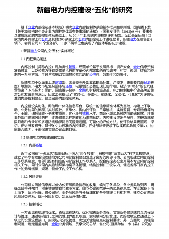 “”新疆电力内控建设五化的研究 继《企业内部控制基本规范》明确企业内部控制体系的基本框架和原则后,国资委下发《关于加快构建中央企业内部控制体系有关事项的通知》(国资发评价〔2012〕68号)要求央企建成规范的内部控制体系基础上,从2014年起报送内部控制评价报告。至此央企所属102家境内外同时上市公司及其他200余家上市公司内部控制工作进程显著。新疆电力在财务部引领下,会同公司10个业务部、13家下属单位也实现了内控体系的初步建设。 1 新疆电力“”公司内控五化实施概述 1.1 内控概论阐...