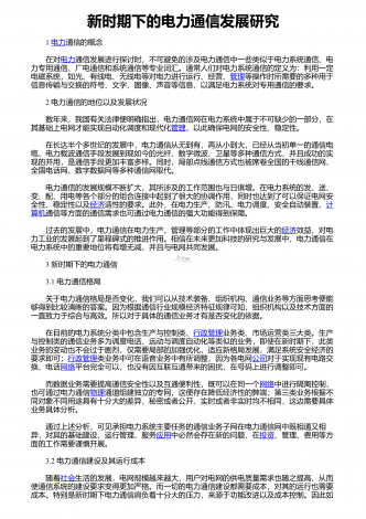 新时期下的电力通信发展研究 1 电力通信的概念 在对电力通信发展进行探讨时,不可避免的涉及电力通信中一些类似于电力系统通信、电力专用通信、厂电通信和系统通信等专业词汇。通常人们对电力系统通信的定义为:利用一定电磁系统,如光、有线电、无线电等对电力进行运行、经营、管理等操作时所需要的多种用于信息传输与交换的符号、文字、图像、声音等信息,以满足电力系统对专用通信的要求。 2 电力通信的地位以及发展状况 数年来,我国有关法律便明确指出,电力通信网在电力系统中属于不可缺少的一部分,在其基础上电网...