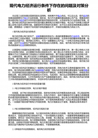 现代电力经济运行条件下存在的问题及对策分析 无论是工业的发展还是居民的生活用电,统统离不开电力供应。可以这么说,现代经济的发展命脉都寄托于电力行业的发展。现阶段,电力作为重要的基础能源公共产品,需要政府积极出面对电力经济运行中存在的问题积极找寻相应的对策,从而保证电力行业的良好发展。目前,现代电力经济运行条件中存在的问题主要有电力价格的不稳定、电力生产与供需之间的矛盾以及电力成本过高等方面。国家政府在对其进行改革时,应不仅从实际运用的角度出发解决问题,更需要进一步着手于如何提升供电质量和水平,...