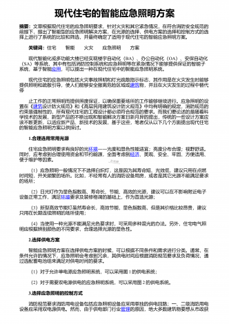 现代住宅的智能应急照明方案摘要:文章根据现代住宅的应急照明要求,针对火灾和其它紧急情况,在符合消防安全规范的前提下,提出了智能型的应急照明解决方案,在光源的选择,供电方案的选择和控制方式的选择上进行了系统的比较和筛选,并最终确定了适用于现代住宅的智能应急照明方案。关键词:住宅智能火灾应急照明方案现代智能化或多功能大楼已经实现楼宇自动化(BA)、办公自动化(OA)、安保自动化(SA)等系统,其中有包括消防控制系统和应急照明等在紧急情况下能够提供保证的智能子系统,基于智能应用,可以提出一种在现代住宅...