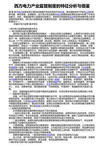 西方电力产业监管制度的特征分析与借鉴摘要现代电力监管体系主要目的是维护有效竞争的市场环境,解决输配电环节电网公司的垄断问题,降低资费,改善服务。由于西方发达国家在电力监管制造改革的实践中积累了许多经验教训,因此,借鉴国际电力监管的经验教训,紧密结合我国转轨经济的特殊背景和电力改革进程的具体情况,进行电力监管制度上的模仿和创新,成为我国现代电力监管体系构建过程中的路径之一。关键词电力监管基本特征1西方电力监管制度的基本特点1.1电力监管机构的设置和属性国外电力监管主要有两种典型的模式,一是独立的电...