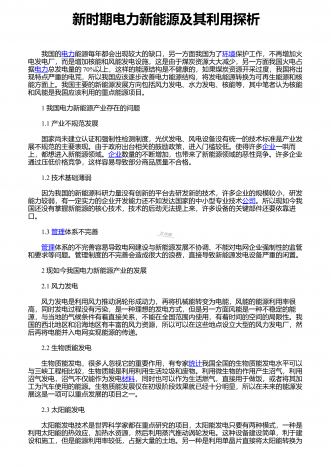 新时期电力新能源及其利用探析 我国的电力能源每年都会出现较大的缺口,另一方面我国为了环境保护工作,不再增加火电发电厂,而是增加核能和风能发电设施,这是由于煤炭资源大大减少,另一方面我国火电占据电力总发电量的70%以上,这样的能源结构是不健康的,如果煤炭资源开采过度,我国将出现特点严重的电荒,所以我国应该逐步改善电力能源结构,将发电能源转换为可再生能源和核能方面上。我国主要的新能源发展方向包括风力发电、水力发电、核能等,其中笔者认为核能和风能是我国应该利用的重点能源项目。 1 我国电力新能源产...