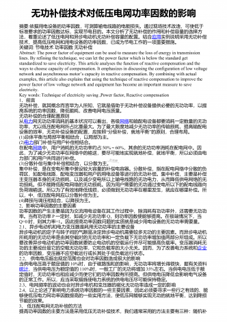 无功补偿技术对低压电网功率因数的影响摘要:依据用电设备的功率因数,可测算输电线路的电能损失。通过现场技术改造,可使低于标准要求的功率因数达标,实现节电目的。本文分析了无功补偿的作用和补偿容量的选择方法,着重论述了低压电网和异步电动机无功补偿容量的配置。结合应用实例说明采用无功补偿技术,提高低压电网和用电设备的功率因数,已成为节电工作的一项重要措施。关键词:节电技术功率因数无功补偿Abstract:Thepowerfactorofequipmentcanbeusedtomeasuretheloss...
