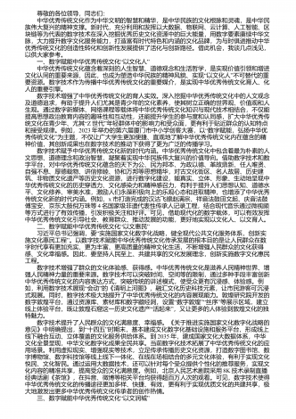 尊敬的各位领导,同志们: 中华优秀传统文化作为中华文明的智慧和精华,是中华民族的文化根脉和灵魂,是中华民族伟大复兴的精神支撑。新时代,充分利用和发挥以大数据、物联网、云计算、人工智能、区块链等为代表的数字技术在深入挖掘优秀历史文化资源中的巨大能量,用数字要素赓续中华文脉,大力提升数字文化服务能力,打造富有时代特色和内涵的文化品牌,为与时俱进推动中华优秀传统文化的创造性转化和创新性发展提供了活化与创新路径。借此机会,我谈几点浅见,以供大家参考。 “”一、数字赋能中华优秀传统文化以文化人 ...