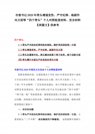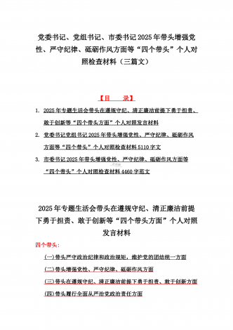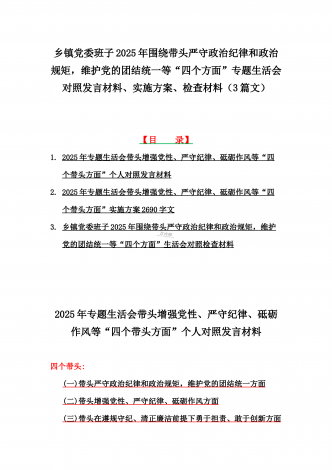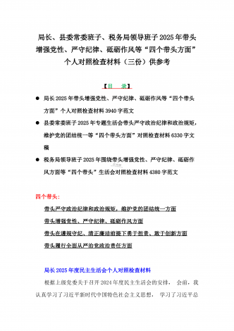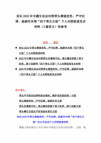 2025年专题生活会带头增强党性、严守纪律、砥砺作风等“四个带头方面”实施方案与局长围绕带头严守政治纪律和政治规矩,维护党的团结统一方面等“四个带头”生活会对照检查材料(2篇文)2025年专题生活会带头增强党性、严守纪律、砥砺作风等“四个带头方面”实施方案四个带头:(一)带头严守政治纪律和政治规矩,维护党的团结统一方面(二)带头增强党性、严守纪律、砥砺作风方面(三)带头在遵规守纪、清正廉洁前提下勇于担责、敢于创新方面(四)带头履行全面从严治党政治责任方面【正文】按照县纪委、县委组织部的相关要求,...