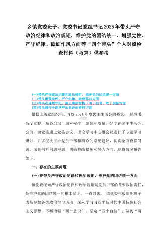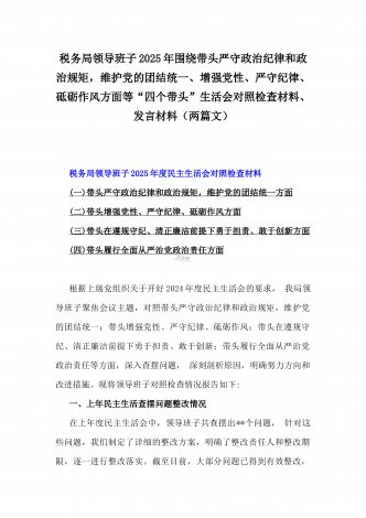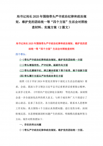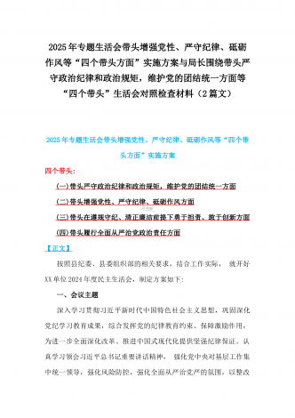 2025年专题生活会带头增强党性、严守纪律、砥砺作风等“四个带头方面”实施方案与局长围绕带头严守政治纪律和政治规矩,维护党的团结统一方面等“四个带头”生活会对照检查材料(2篇文)