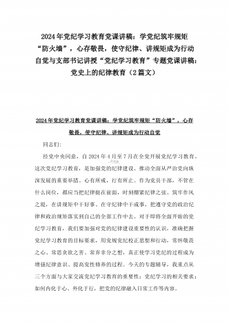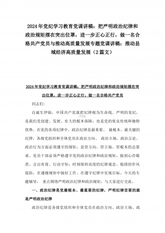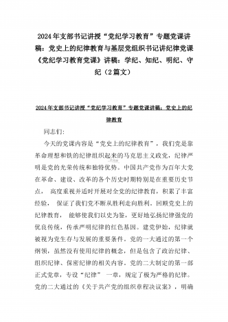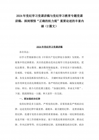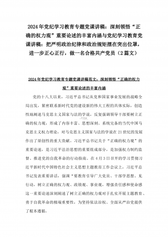 2024年党纪学习教育专题党课讲稿:深刻领悟“正确的权力观”重要论述的丰富内涵与党纪学习教育党课讲稿:把严明政治纪律和政治规矩摆在突出位罩,进一步正心正行,做一名合格共产党员(2篇文)