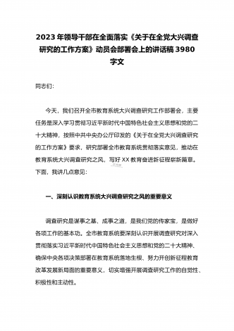 2023年领导干部在全面落实《关于在全党大兴调查研究的工作方案》动员会部署会上的讲话稿3980字文同志们:今天,我们召开全市教育系统大兴调查研究工作部署会,主要任务是深入学习贯彻习近平新时代中国特色社会主义思想和党的二十大精神,按照中共中央办公厅印发的《关于在全党大兴调查研究的工作方案》要求,研究部署全市教育系统贯彻落实意见,推动在教育系统大兴调查研究之风,写好XX教育奋进新征程崭新篇章。下面,我讲几点意见:一、深刻认识教育系统大兴调查研究之风的重要意义调查研究是谋事之基、成事之道,是我们党的传...