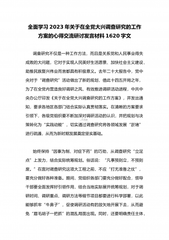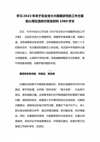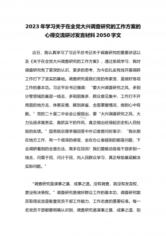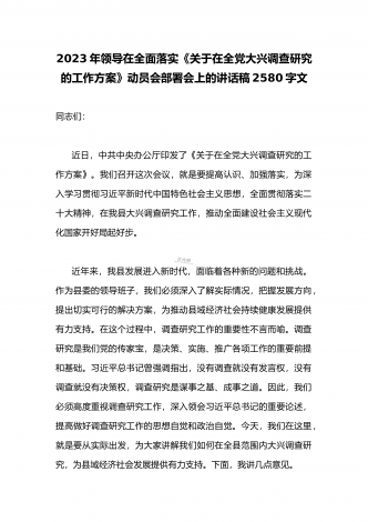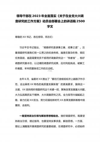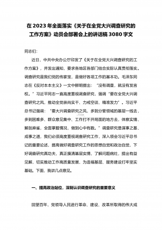 2023年领导干部在全面落实《关于在全党大兴调查研究的工作方案》动员会部署会上的讲话稿3980字文