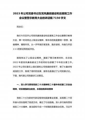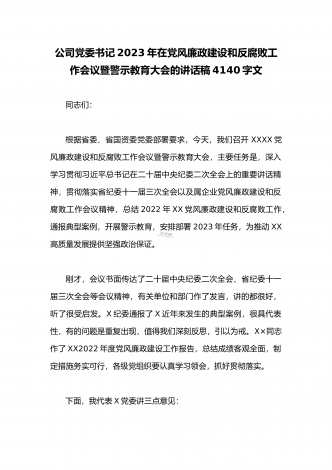 公司党委书记在2023年党风廉政建设和反腐败工作会议暨警示教育大会的讲话稿4040字文同志们:今天我们召开党风廉政建设和反腐败工作会议暨警示教育大会,主要任务是,深入学习贯彻党的二十大精神和习近平总书记在二十届中央纪委二次全会上的重要讲话精神,贯彻落实省纪委十一届三次全会、省属企业党风廉政建设和反腐败工作会议精神以及XX党风廉政建设和反腐败工作会议暨警示教育大会精神,总结2022年公司党风廉政建设和反腐败工作,开展警示教育,安排部署2023年任务,一刻不停推动全面从严治党向纵深发展,为勇创一流X...