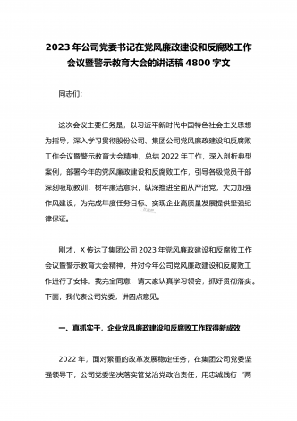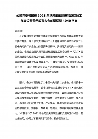 公司党委书记在2023年党风廉政建设和反腐败工作会议暨警示教育大会的讲话稿4040字文