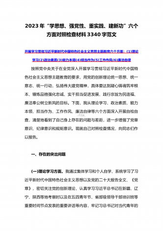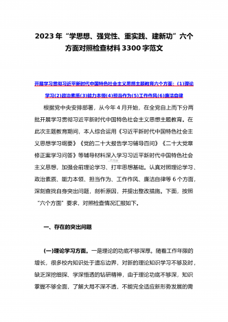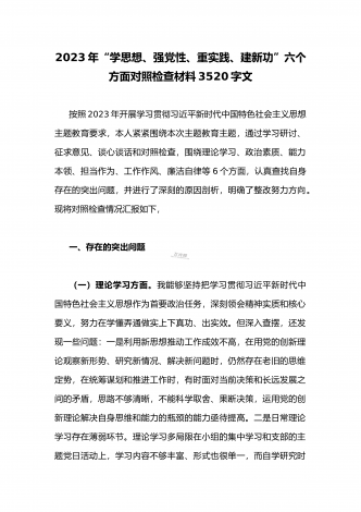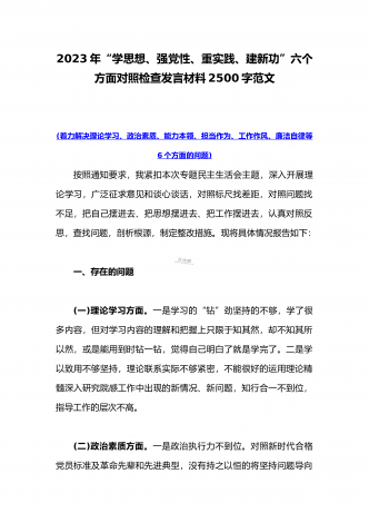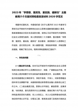 2023年“学思想、强党性、重实践、建新功”主题教育六个方面对照检查发言材料2020字范文