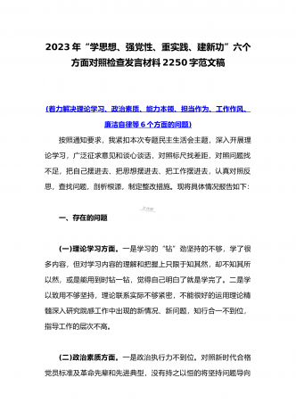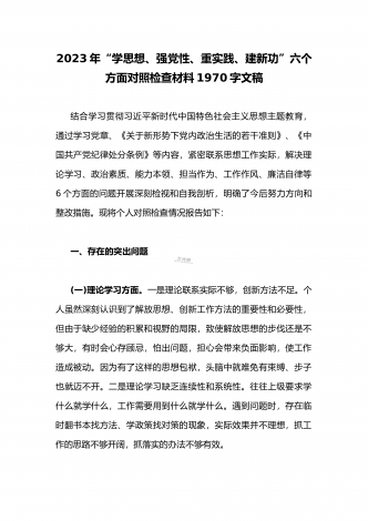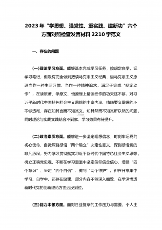 2023年“学思想、强党性、重实践、建新功”主题教育六个方面对照检查发言材料2020字范文根据市纪委机关、市委组织部《关于认真开好2023年度学习贯彻习近平新时代中国特色社会主义思想主题教育的通知》要求,我紧紧围绕此次民主生活会的主题,坚持以习近平新时代中国特色社会主义思想为指导,深入贯彻党的二十大精神,重点围绕“学思想、强党性、重实践、建新功”的总要求,紧密联系个人思想和工作实际,进行党性分析,深入查摆问题,深刻剖析根源,并制定整改措施,明确了努力方向。现将对照检查情况汇报如下:一、存在的问题...