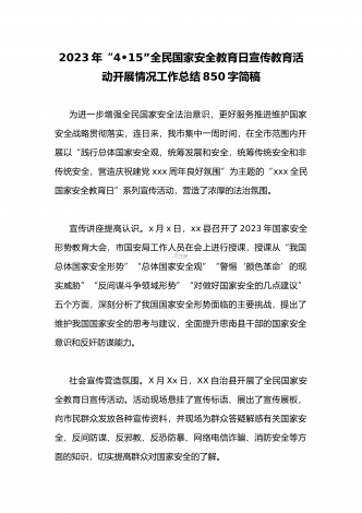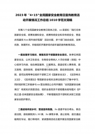 2023年“4•15”全民国家安全教育日宣传教育活动开展情况工作总结1010字范文简稿