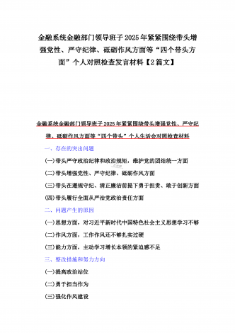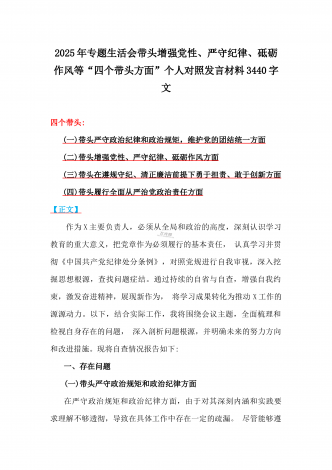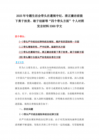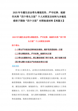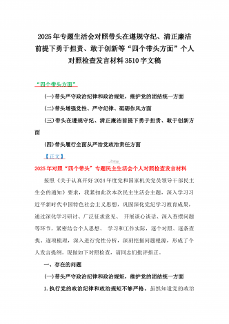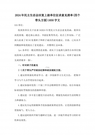 2025年专题生活会对照带头严守政治纪律和政治规矩,维护党的团结统一等“四个方面”个人对照检查发言材料与2024年生活会回复上级单位征求意见清单(四个带头方面)2篇文2025年专题生活会对照带头严守政治纪律和政治规矩,维护党的团结统一等“四个方面”个人对照检查发言材料“四个带头方面”(一)带头严守政治纪律和政治规矩,维护党的团结统一方面(二)带头增强党性、严守纪律、砥砺作风方面(三)带头在遵规守纪、清正廉洁前提下勇于担责、敢于创新方面(四)带头履行全面从严治党政治责任方面【正文】2025年对照“...