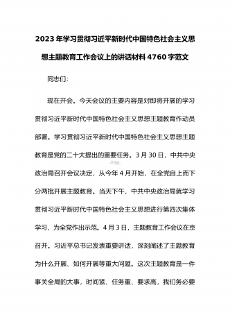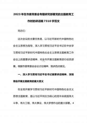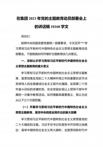 2023年在公司学习贯彻习近平新时代中国特色社会主义思想主题教育工作会议上的动员讲话稿7230字文同志们:深入开展学习贯彻习近平新时代中国特色社会主义思想主题教育,是以习近平同志为核心的党中央全面贯彻党的二十大精神、动员全党同志为完成党的中心任务而团结奋斗所作的重大部署,是深入推进新时代党的建设新的伟大工程的重大部署。经省委第**指导组同意,**今天召开学习贯彻习近平新时代中国特色社会主义思想主题教育工作会议,主要任务是深入学习贯彻习近平总书记在学习贯彻习近平新时代中国特色社会主义思想主题教育工...