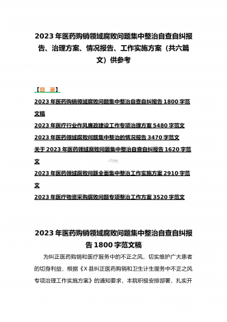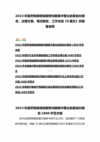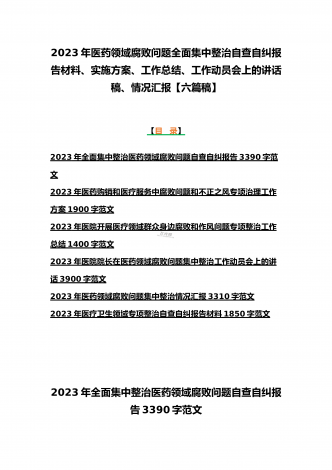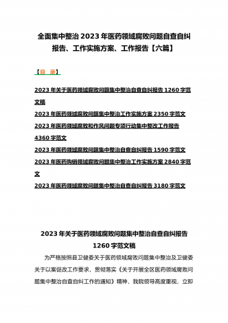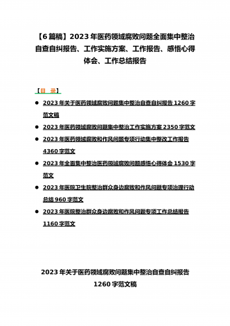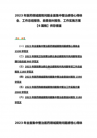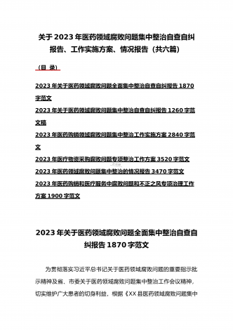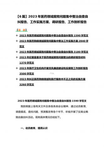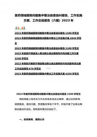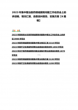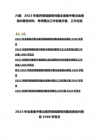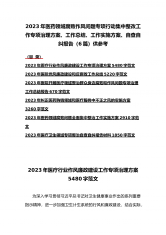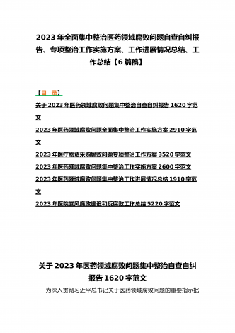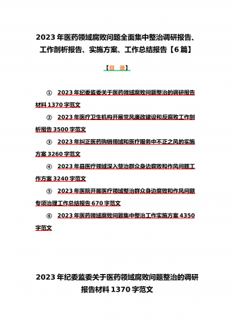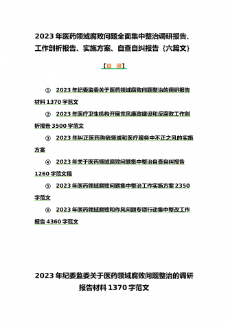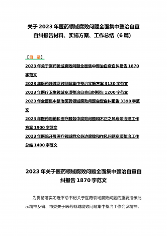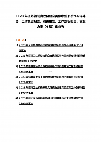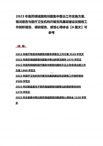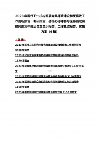 2023年医疗卫生机构开展党风廉政建设和反腐败工作剖析报告、调研报告、感悟心得体会与医药领域腐败问题集中整治自查自纠报告、工作总结报告、实施方案(6篇)(目录)2023年医疗卫生机构开展党风廉政建设和反腐败工作剖析报告3500字范文2023年纪委监委关于医药领域腐败问题整治的调研报告材料1370字范文2023年全面集中整治医药领域腐败问题感悟心得体会1530字范文2023年医药领域腐败问题集中整治自查自纠报告3180字范文2023年医院整治群众身边腐败和作风问题专项工作总结报告1160字范文20...