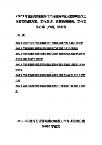 2023年医药领域腐败作风问题专项行动集中整改工作专项治理方案、工作总结与医疗卫生机构开展党风廉政建设反腐败工作剖析报告、调研报告、感悟心得体会【六篇文】可参考(目录)① 2023年医疗行业作风廉政建设工作专项治理方案5480字范文② 2023年医院党风廉政建设和反腐败工作总结5220字范文③ 2023年医院开展医疗领域整治群众身边腐败和作风问题专项治理工作总结报告670字范文④ 2023年医疗卫生机构开展党风廉政建设和反腐败工作剖析报告3500字范文⑤ 2023年纪委监委关于医药领域腐败问题整...