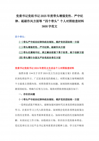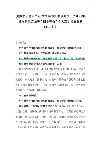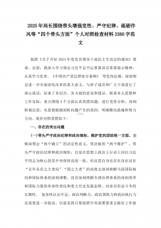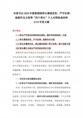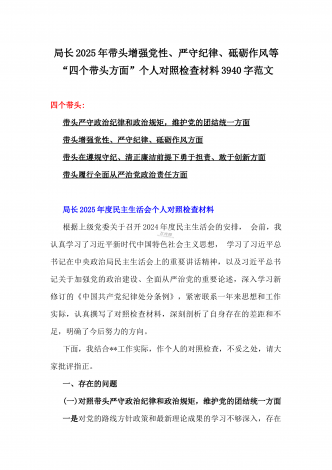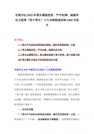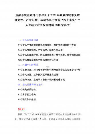 金融系统金融部门领导班子2025年紧紧围绕带头增强党性、严守纪律、砥砺作风方面等“四个带头”个人生活会对照检查材料3840字范文一、存在的突出问题(一)带头严守政治纪律和政治规矩,维护党的团结统一方面(二)带头增强党性、严守纪律、砥砺作风方面(三)带头在遵规守纪、清正廉洁前提下勇于担责、敢于创新方面(四)带头履行全面从严治党政治责任方面二、问题产生的原因(一)思想方面,对习近平新时代中国特色社会主义思想学习不够(二)作风方面,工作作风还不够扎实过硬(三)能力方面,主动学习增长本领的紧迫感不足三、...