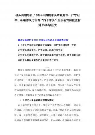 金融系统金融部门领导班子2025年紧紧围绕带头增强党性、严守纪律、砥砺作风方面等“四个带头”个人生活会对照检查材料3840字范文