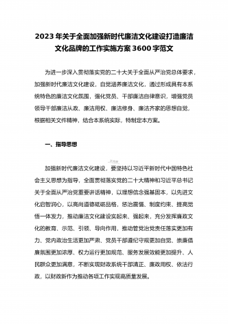 2023年关于全面加强新时代廉洁文化建设打造廉洁文化品牌的工作实施方案3600字范文为进一步深入贯彻落实党的二十大关于全面从严治党总体要求,加强新时代廉洁文化建设,自觉涵养廉洁文化,通过形成具有本系统特色的廉洁文化氛围,强化党员、干部廉洁自律意识,增强党员领导干部廉洁从政、廉洁用权、廉洁修身、廉洁齐家的思想自觉,根据相关文件精神,结合本系统实际,特制定本方案。一、指导思想加强新时代廉洁文化建设,要坚持以习近平新时代中国特色社会主义思想为指导,全面贯彻落实党的二十大精神和习近平总书记关于全面从严治...