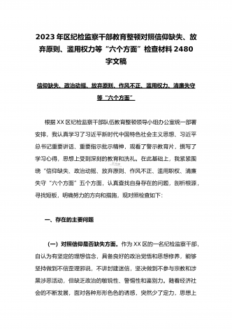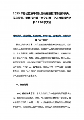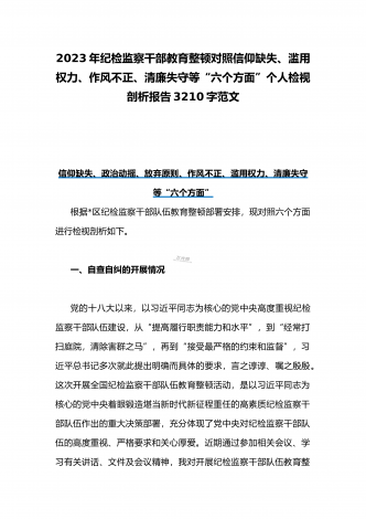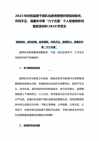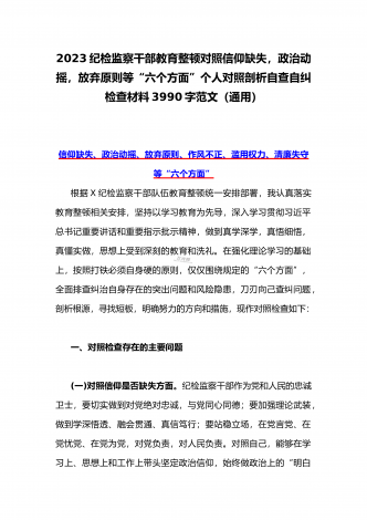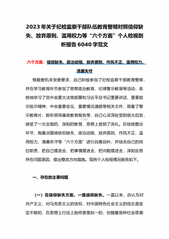 2023纪检监察干部教育整顿对照信仰缺失,政治动摇,放弃原则等“六个方面”个人对照剖析自查自纠检查材料3990字范文(通用)