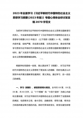 2023年全面学习《习近平新时代中国特色社会主义思想学习纲要(2023年版)》专题心得体会研讨发言稿2070字范文为把学习贯彻习近平新时代中国特色社会主义思想主题教育引向深入,中央宣传部组织编写了《习近平新时代中国特色社会主义思想学习纲要(2023年版)》(以下简称《纲要》)一书。《纲要》内容丰富、结构严整,忠实原文原著、文风生动朴实,是全党开展学习贯彻习近平新时代中国特色社会主义思想主题教育的重要学习材料,是广大党员干部群众深入学习领会习近平新时代中国特色社会主义思想的重要辅助读物。根据学校党...