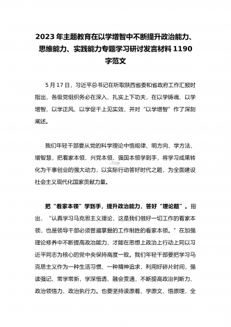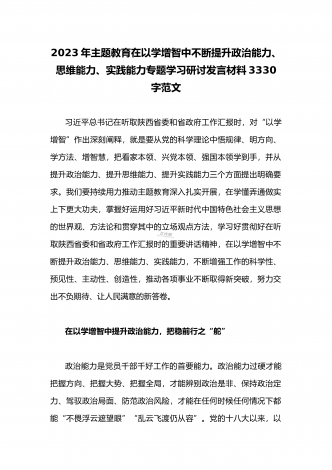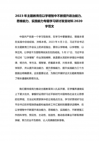 2023年主题教育在以学增智中不断提升政治能力、思维能力、实践能力专题学习研讨发言材料2020字范文