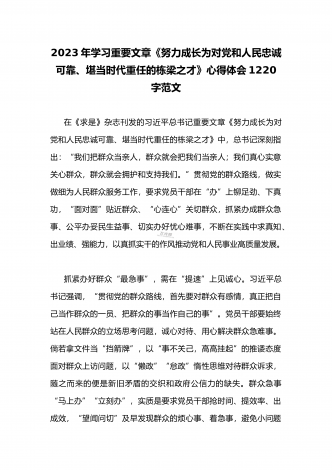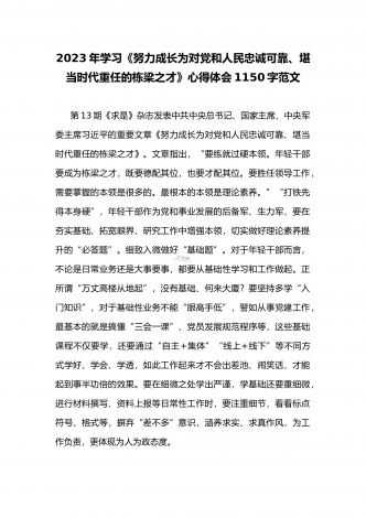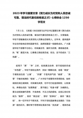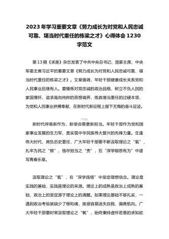 2023年学习重要文章《努力成长为对党和人民忠诚可靠、堪当时代重任的栋梁之才》心得体会1230字范文