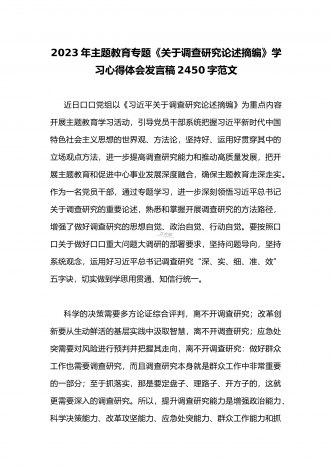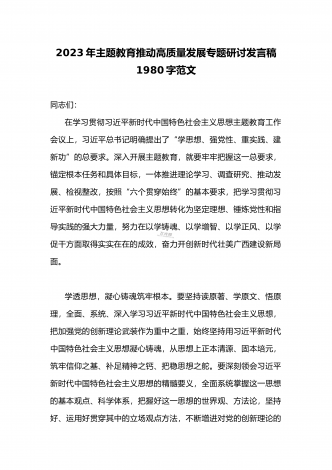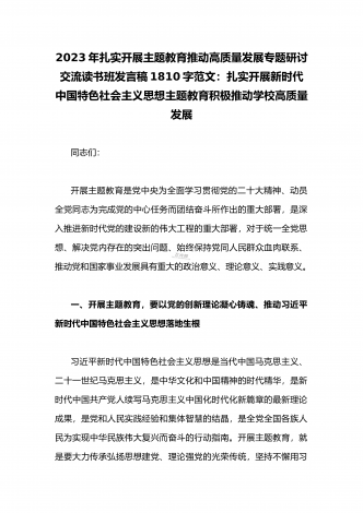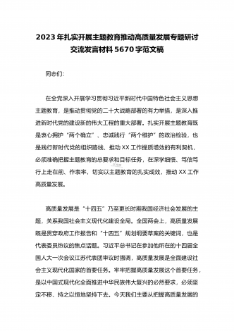 2023年扎实开展主题教育推动高质量发展专题研讨交流发言材料2910字范文:坚定理想锤炼党性指导实践推动发展以勇于自我革命的精神和作为推动企业高质量发展同志们:如何跳出治乱兴衰的历史周期率,实现长期执政,是我们党始终在思考和实践的重大问题。延安时期,毛泽东同志给出了第一个答案,这就是“让人民来监督政府”。70多年后,又给出了自我革命这第二个答案。我们要保持解决大党独有难题的清醒和坚定,坚持不懈深化自我革命,把自身锻造得更加坚强有力。通过近期主题教育学习,大家一定也有了更深的认知和认识,我们要坚持...