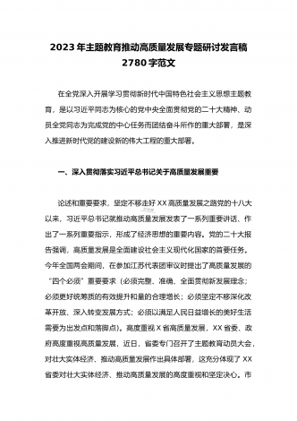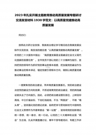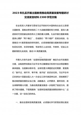 2023年扎实开展主题教育推动高质量发展专题研讨交流发言材料2910字范文2023年扎实开展主题教育推动高质量发展专题研讨交流发言材料2910字范文:坚定理想锤炼党性指导实践推动发展以勇于自我革命的精神和作为推动企业高质量发展.docx