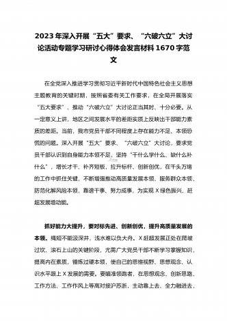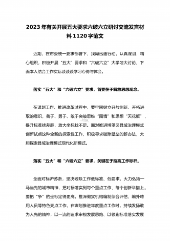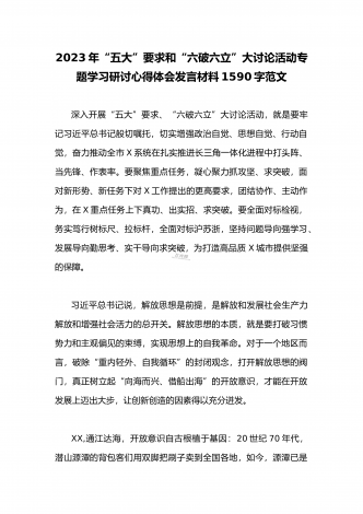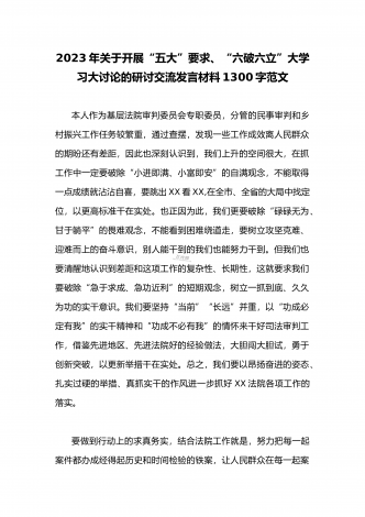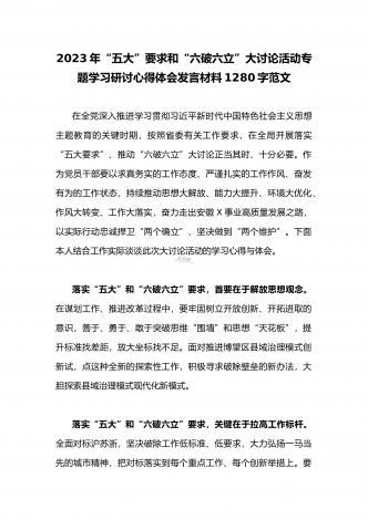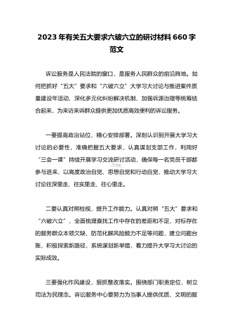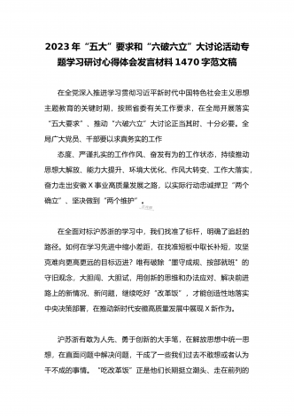 2023年县委班子“五大”要求和“六破六立”大学习大讨论活动自查报告研讨剖析对照检查材料3020字范文按照《关于开展“五大”要求、“六破六立”大学习大讨论活动的实施方案》要求,XX县委高度重视,第一时间召开专题会议安排部署工作任务,利用两周时间,组织全体党员干部围绕“是否存在党员干部精神不在状态、工作标杆降低的问题;围绕对标沪苏浙、大合肥、长三角,剖析是否存在创新意识不足、奋勇争先勇气不够的问题”开展封闭研讨,查存在问题、查思想根源、查责任落实,确保“五大”要求和“六破六立”大学习大讨论活动取得...