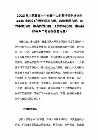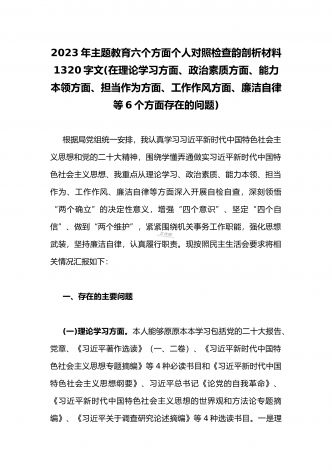 2023年主题教育六个方面个人对照检查韵剖析材料1320字文(在理论学习方面、政治素质方面、能力本领方面、担当作为方面、工作作风方面、廉洁自律等6个方面存在的问题)
