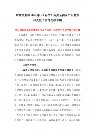 财政局党组2024年落实全面从严治党主体责任工作情况报告2560字范文稿市财政局坚持以习近平新时代中国特色社会主义思想为指导,坚决履行全面从严治党主体责任,深入学习贯彻党的二十大及二十届二中、三中全会精神,坚持以党的政治建设为统领,坚持不懈贯彻落实习近平总书记“7·9”重要讲话精神,认真落实新时代党的建设总要求和新时代党的组织路线,聚焦“走在前、勇争先、善作为”目标要求,深化模范机关创建、打造“四强”党支部,不断推进党建工作与财政业务深度融合、互促互进,以基层党建的提质增效助推财政高质量发展。一...
