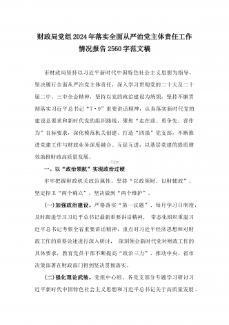 财政局党组2024年落实全面从严治党主体责任工作情况报告2560字范文稿