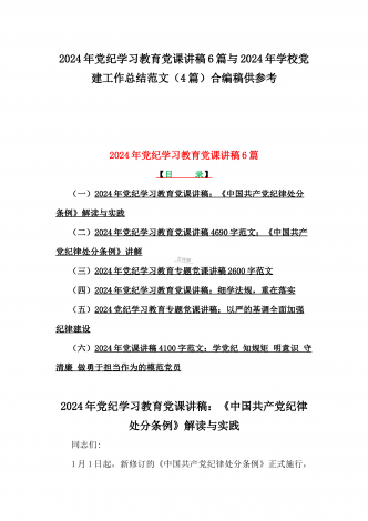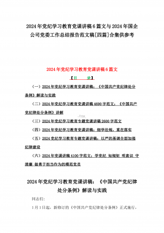 2024年第四季度纪检监察机关专题党课讲稿【七篇】与2024年全面落实从严治党主体责任工作情况报告汇编(3篇)合集供参考2024(第四季度)纪检监察机关专题党课讲稿:严守纪律底线树立纪检监察良好形象同志们:今天,我们在这里进行一堂以“*严守纪律底线,树立纪检监察良好形象”为主题的党课。党的纪律是党的生命线,对于纪检监察干部来说,严守纪律底线更是至关重要。纪检监察机关作为党内监督和国家监察的专责机关,肩负着重大的历史使命和政治责任,只有严守纪律底线,才能树立起良好的形象,为党风廉政建设和反腐败斗争...