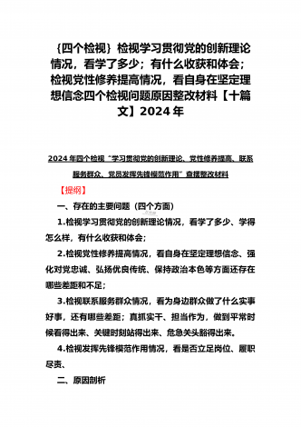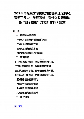 重点围绕“检视学习贯彻党的创新理论,检视联系服务群众,检视发挥先锋模范作用情况、看学了多少、学得怎么样,有什么收获和体会”等四个检视对照检查材料2024年(2篇文)2024年学习贯彻党的创新理论情况,看学了多少、学得怎么样,有什么收获和体会四个检视对照检查材料存在的主要问题(四个方面)1.检视学习贯彻党的创新理论情况,看学了多少、学得怎么样,有什么收获和体会;2.检视党性修养提高情况,看自身在坚定理想信念、强化对党忠诚、弘扬优良传统、保持政治本色等方面还存在哪些差距和不足;3.检视联系服务群众情...
