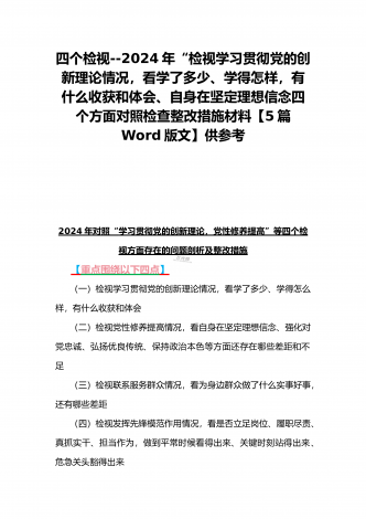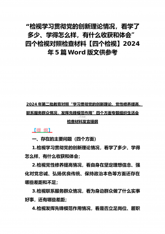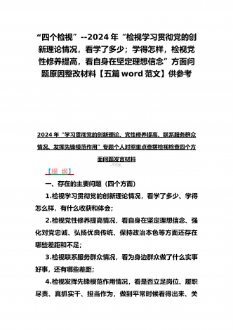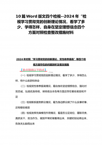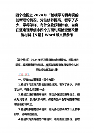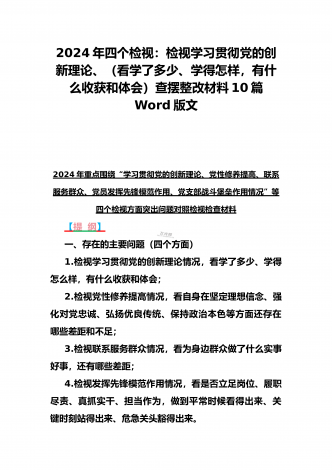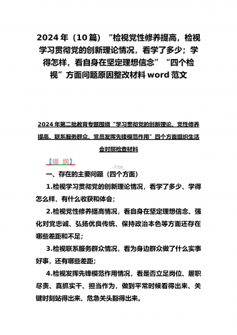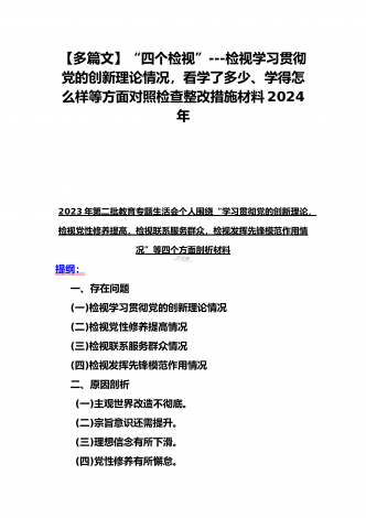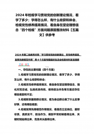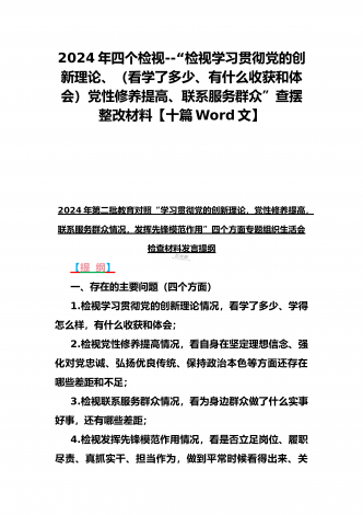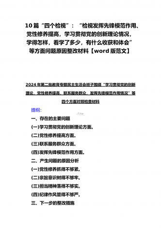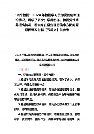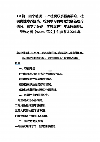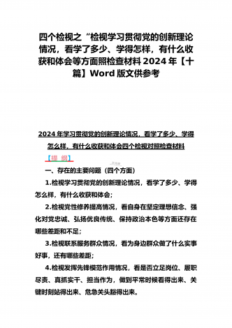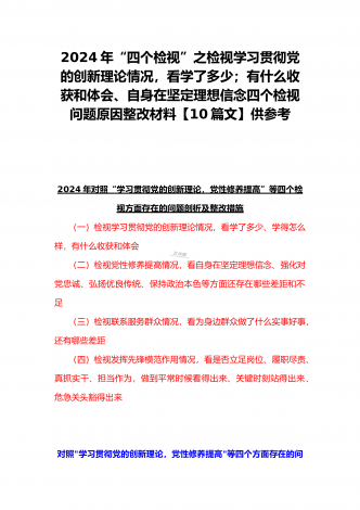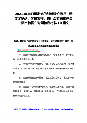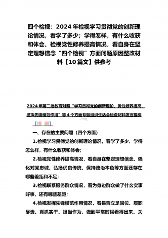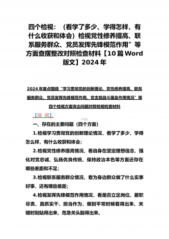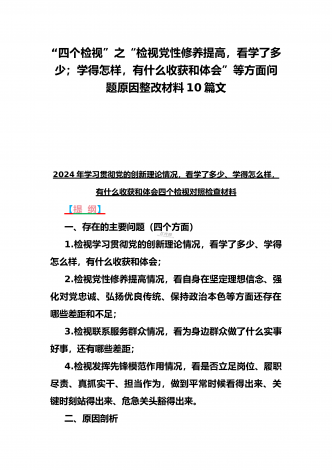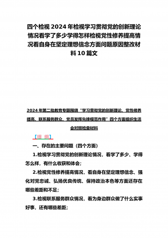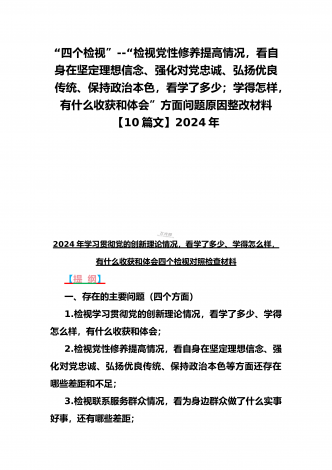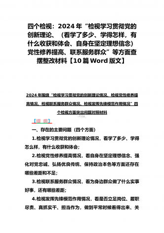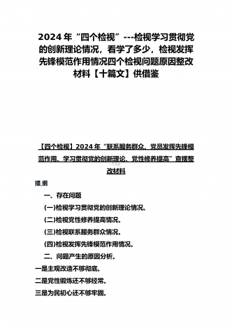 2024年“四个检视”---检视学习贯彻党的创新理论情况,看学了多少;学得怎样,有什么收获和体会,检视联系服务群众、检视党性修养提高情况,检视发挥先锋模范作用情况四个检视问题原因整改材料【10篇文】