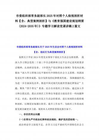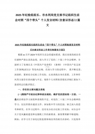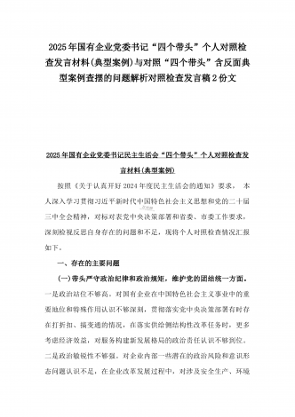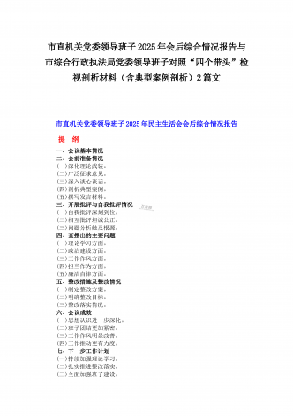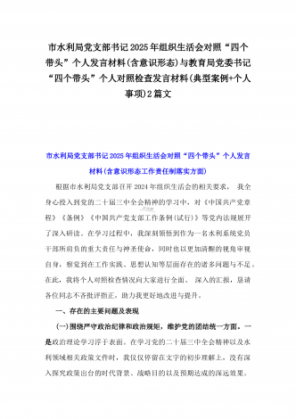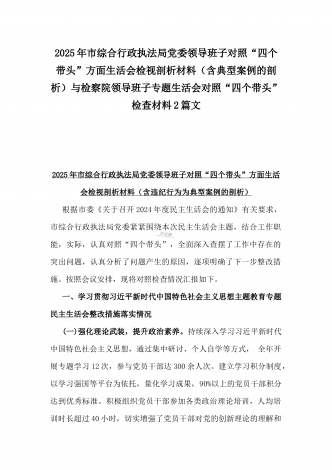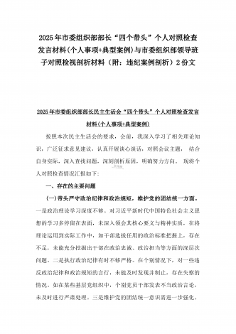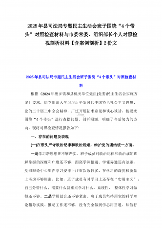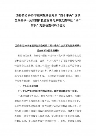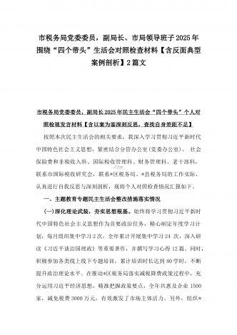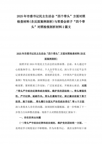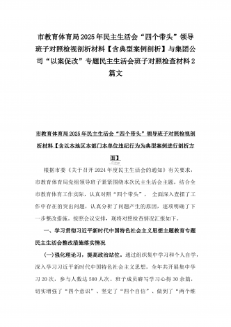 市教育体育局党组书记、局长领导班子2025年“四个带头”对照检视剖析材料【含典型案例】与市红十字会党支部书记组织生活会“四个带头”个人对照检查发言材料【含意识形态】2篇文市教育体育局党组书记、局长领导班子2025年民主生活会个人“四个带头”对照检视剖析材料【含典型案例,举一反三进行剖析方面】根据市委《关于召开2024年度民主生活会的通知》有关要求,我紧紧围绕本次民主生活会主题,结合全市教育体育工作实际,认真对照“四个带头”,全面深入查摆了工作中存在的突出问题,认真分析了问题产生的原因,逐项明确了...