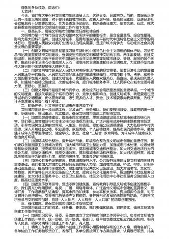 尊敬的各位领导、同志们: 大家好! 今天,我们在这里召开文明城市创建动员大会,这是县委、县政府立足当前、着眼长远作出的一项重大决策部署,对于提升我县城市形象、改善人居环境、提高居民素质、促进经济社会发展具有十分重要的意义。作为县委宣传部部长,我深感责任重大、使命光荣。在此,我代表县委宣传部就做好文明城市创建工作作如下发言。 一、提高认识,增强文明城市创建的责任感和使命感 文明城市是一个城市综合实力和整体文明水平的重要标志,是含金量最高、综合性最强、影响力最大的城市品牌。创建文明城市,...