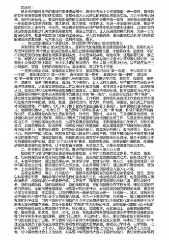 同志们: 机关党的建设是党的建设的重要组成部分,直接关系党中央权威和集中统一领导,直接影响党中央决策部署贯彻落实成效,直接体现为人民群众的利益诉求能否实现。习近平总书记强调,新时代新征程上,要坚持和加强党的全面领导和党中央集中统一领导,深刻领会和把握进一步全面深化改革的主题、重大原则、重大举措、根本保证,在进一步全面深化改革、推进中国式现代化上走在前、作示范。各级机关党组织必须严格落实机关党建主体责任,以深化党的建设制度改革推动机关党建高质量发展,建设让党放心、让人民满意的模范机关,为进一...