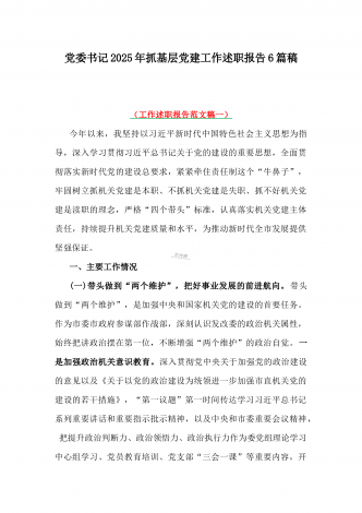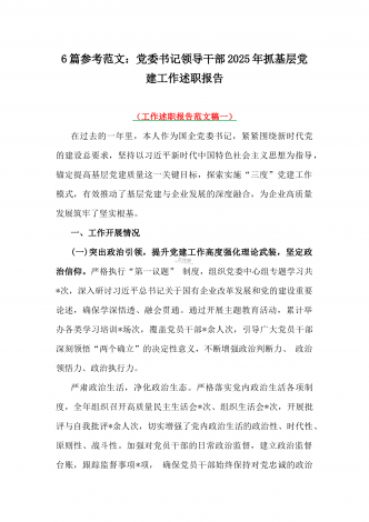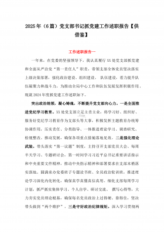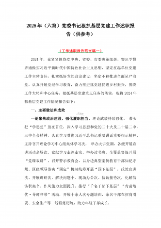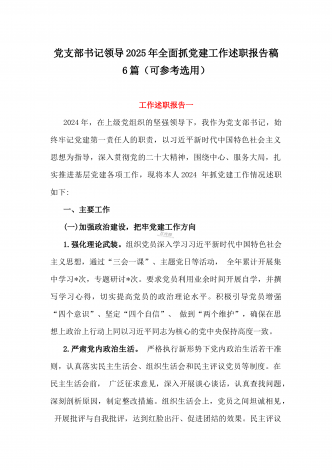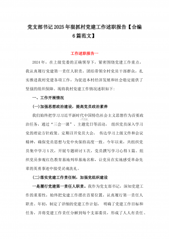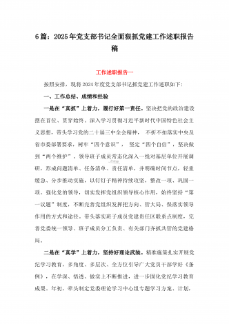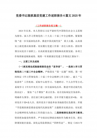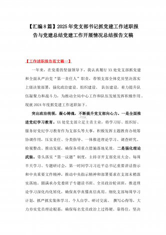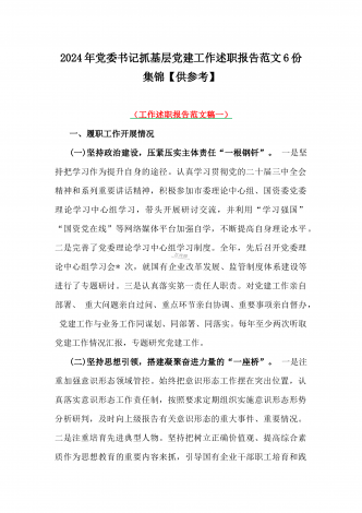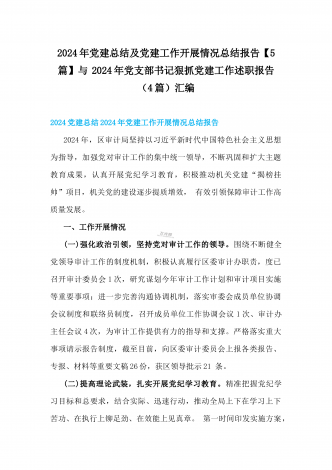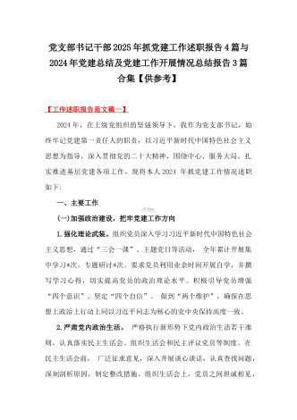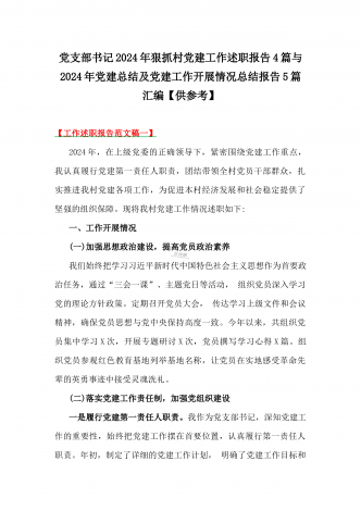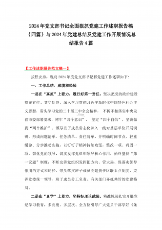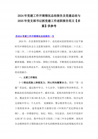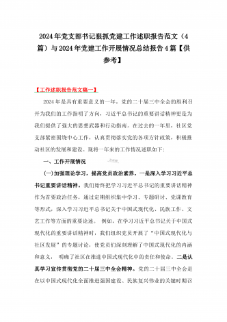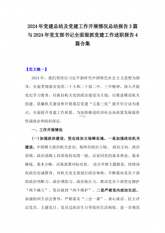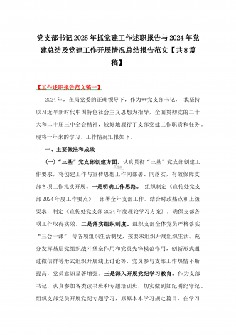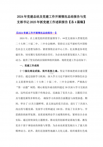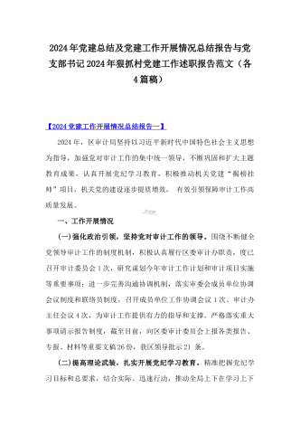2024年党建总结党建工作开展情况总结报告与党支部书记干部2025年全面抓党建工作述职报告范文稿【各4篇】供借鉴