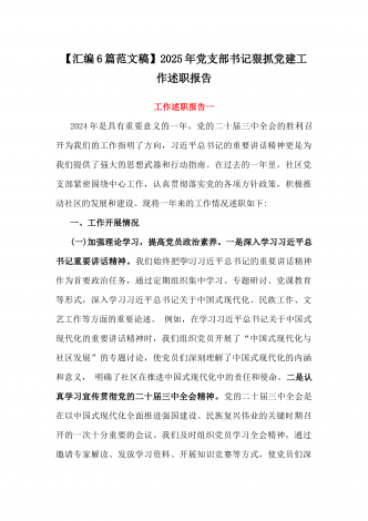 2024年党建总结党建工作开展情况总结报告与党支部书记干部2025年全面抓党建工作述职报告范文稿【各4篇】供借鉴【2024党建工作开展情况总结报告一】2024年是实施“十四五”规划的关键之年,在直属党委的坚强领导下,**党支部始终坚持以习近平新时代中国特色社会主义思想为指导,深入贯彻党的二十大和二十届二中、三中全会精神,认真开展党纪学习教育工作,从严落实上级党委各项决策部署,不断强化职能、提升服务,坚持把党的政治建设摆在首位,引导党员干部增强“四个意识”,坚定“四个自信”,做到“两个维护”,不断...