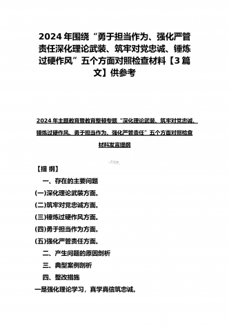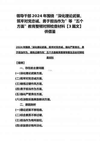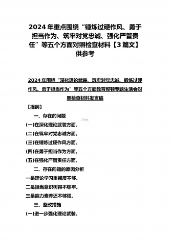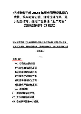 四个检视:2024年基层党员个人围绕“检视学习贯彻党的创新理论,检视党性修养提高,检视联系服务群众,检视发挥先锋模范作用情况”四个方面剖析检查材料5份【Word版】供参考——基层党员检视学习贯彻党的创新理论、党性修养提高、联系服务群众、发挥先锋模范作用情况四个方面专题个人对照检视剖析检查材料提纲:一、存在问题(一)检视学习贯彻党的创新理论情况。(二)检视党性修养提高情况。(三)检视联系服务群众情况。(四)检视发挥先锋模范作用情况。二、产生问题的根源。(一)党性修养不牢固。(二)宗旨意识不强。(三...