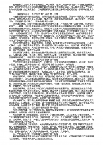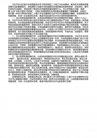 习近平总书记就中央和国家机关学习贯彻党的二十届三中全会精神、推动机关党建高质量发展作出的重要指示,深刻阐明了加强中央和国家机关党的建设的指导思想、总体目标、重点任务和方法路径,深刻回答了推动机关党建高质量发展抓什么、怎么抓等重大问题,既部“”“”署过河任务又提供桥和船,为我们全面提高机关党的建设质量提供了重要遵循、总指引。我们要一体学习贯彻好党的二十届三中全会精神和习近平总书记重要指示精神,全面提高机关党建质量,在进一步全面深化改革、推进中国式现代化中充分发挥坚强保障作用。 一、充分发挥坚...
