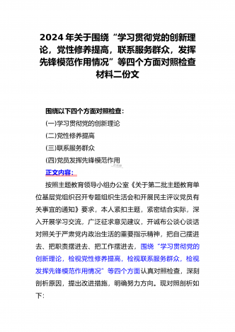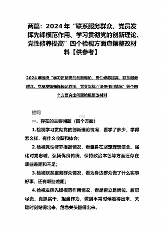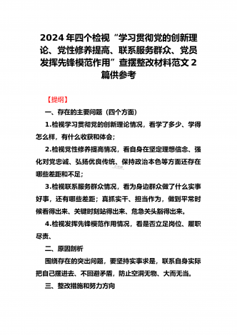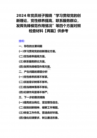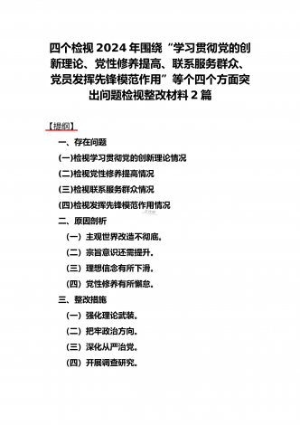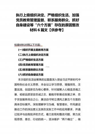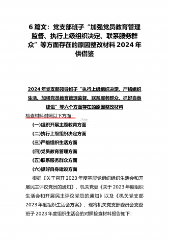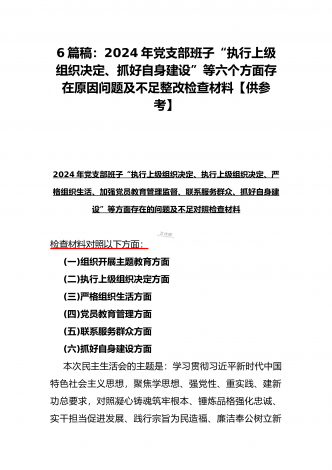 2024年支部班子“组织开展主题教育、执行上级组织决定、严格组织生活、加强党员教育管理监督、联系服务群众、抓好自身建设”六个方面存在的原因整改材料【4篇文】检查材料对照以下方面:(一)组织开展主题教育方面(二)执行上级组织决定方面(三)严格组织生活方面(四)党员教育管理方面(五)联系服务群众方面(六)抓好自身建设方面根据关于召开2023年度专题组织生活会的工作安排,领导班子坚持用习近平新时代中国特色社会主义思想凝心铸魂,聚焦“学思想、强党性、重实践、建新功”的总要求,会前认真组织班子成员学习了党...