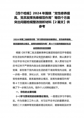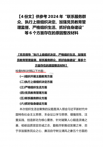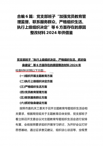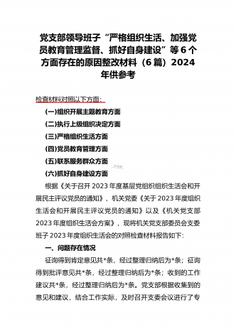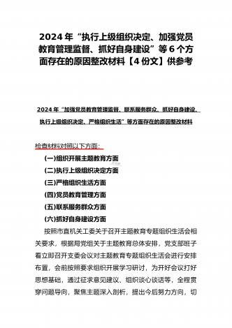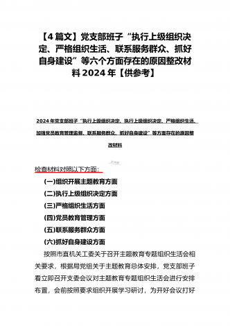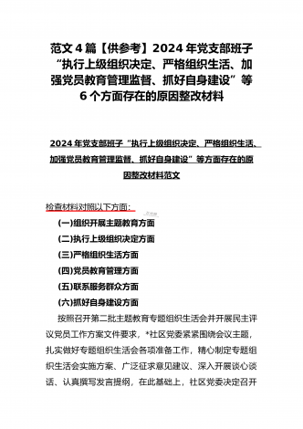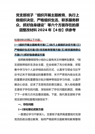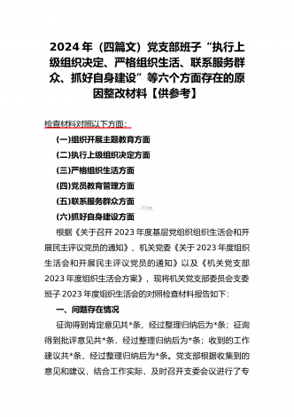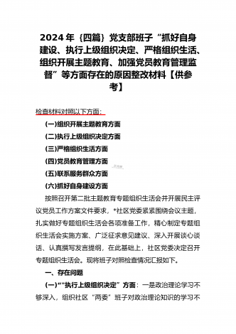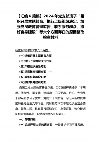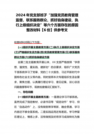 2024年支部班子“组织开展主题教育、执行上级组织决定、严格组织生活、加强党员教育管理监督、联系服务群众、抓好自身建设”六个方面存在的原因整改材料【4篇文】