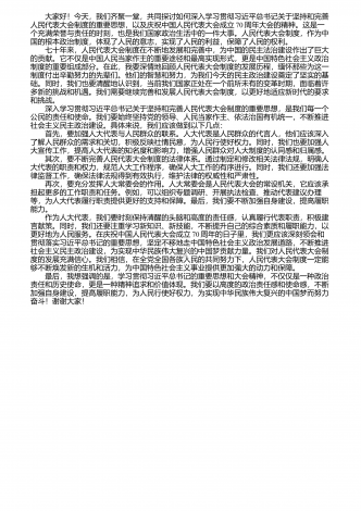 大家好!今天,我们齐聚一堂,共同探讨如何深入学习贯彻习近平总书记关于坚持和完善人民代表大会制度的重要思想,以及庆祝中国人民代表大会成立70周年大会的精神。这是一个充满荣誉与责任的时刻,也是我们国家政治生活中的一件大事。人民代表大会制度,作为中国的根本政治制度,体现了人民的意志,实现了人民的利益,保障了人民的权利。 七十年来,人民代表大会制度在不断地发展和完善中,为中国的民主法治建设作出了巨大的贡献。它不仅是中国人民当家作主的重要途径和最高实现形式,更是中国特色社会主义政治制度的重要组成部分...