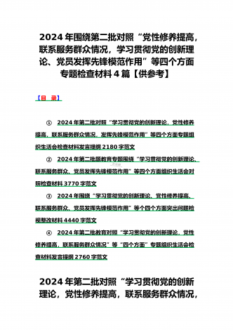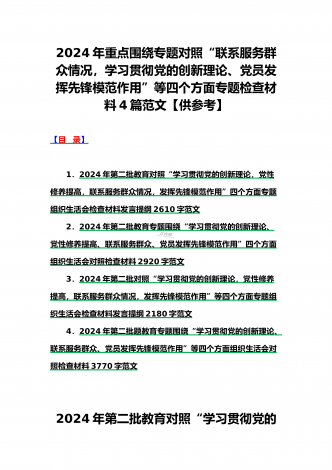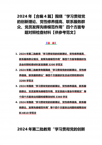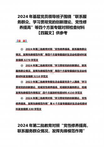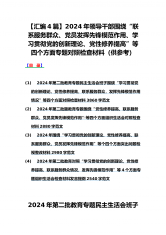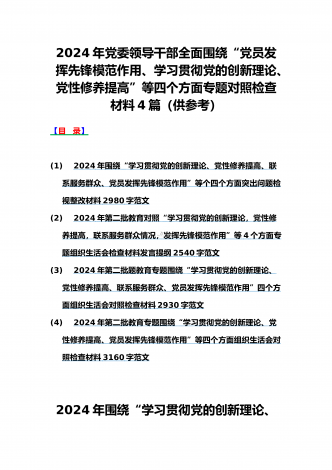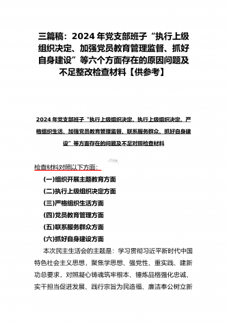 范文4篇:2024年党支部班子“执行上级组织决定、严格组织生活、加强党员教育管理监督、抓好自身建设、组织开展主题教育”等六个方面存在的原因整改材料【供参考】2024年党支部班子“执行上级组织决定、严格组织生活、联系服务群众、抓好自身建设”等“六个方面”存在的原因整改材料检查材料对照以下方面:(一)组织开展主题教育方面(二)执行上级组织决定方面(三)严格组织生活方面(四)党员教育管理方面(五)联系服务群众方面(六)抓好自身建设方面自第二批主题教育开展以来,XX支部严格按照“学思想、强党性、重实践、...