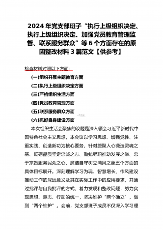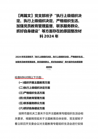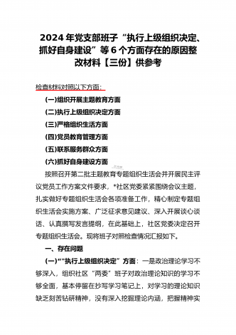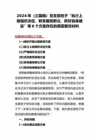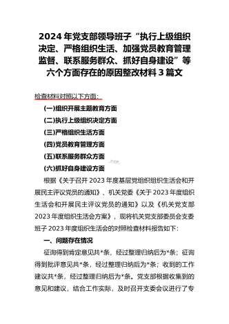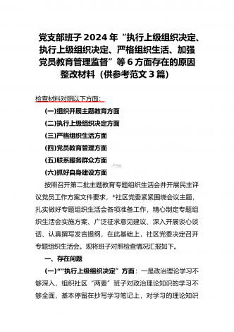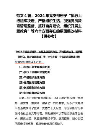 范文4篇:2024年党支部班子“执行上级组织决定、严格组织生活、加强党员教育管理监督、抓好自身建设、组织开展主题教育”等六个方面存在的原因整改材料【供参考】